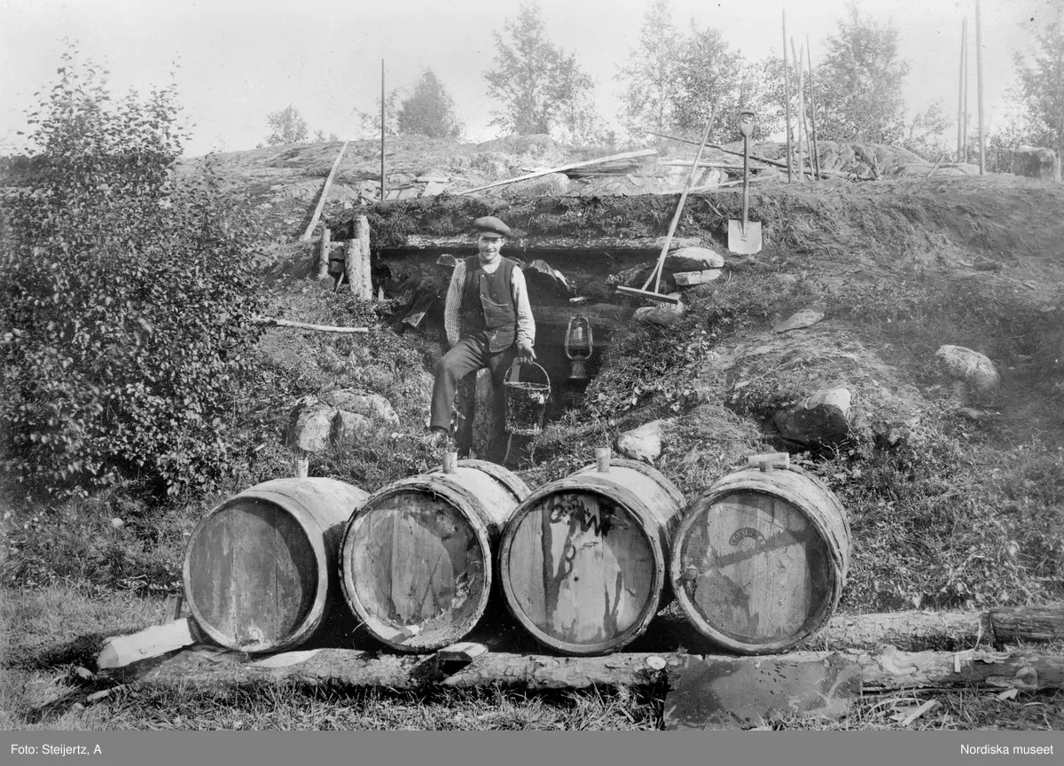 Skogsbruk. Tjärdal. En man och fyra tunnor framför öppningen på tjärdalen. Simonstorp, Östergötland.