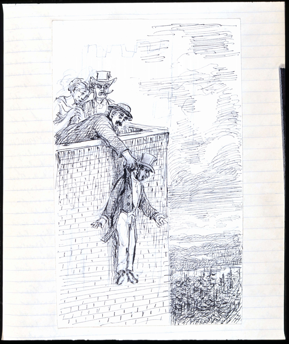 Torn på Bogesund, en man hålls hängande utanför muren. Tuschteckning av Fritz von Dardel.