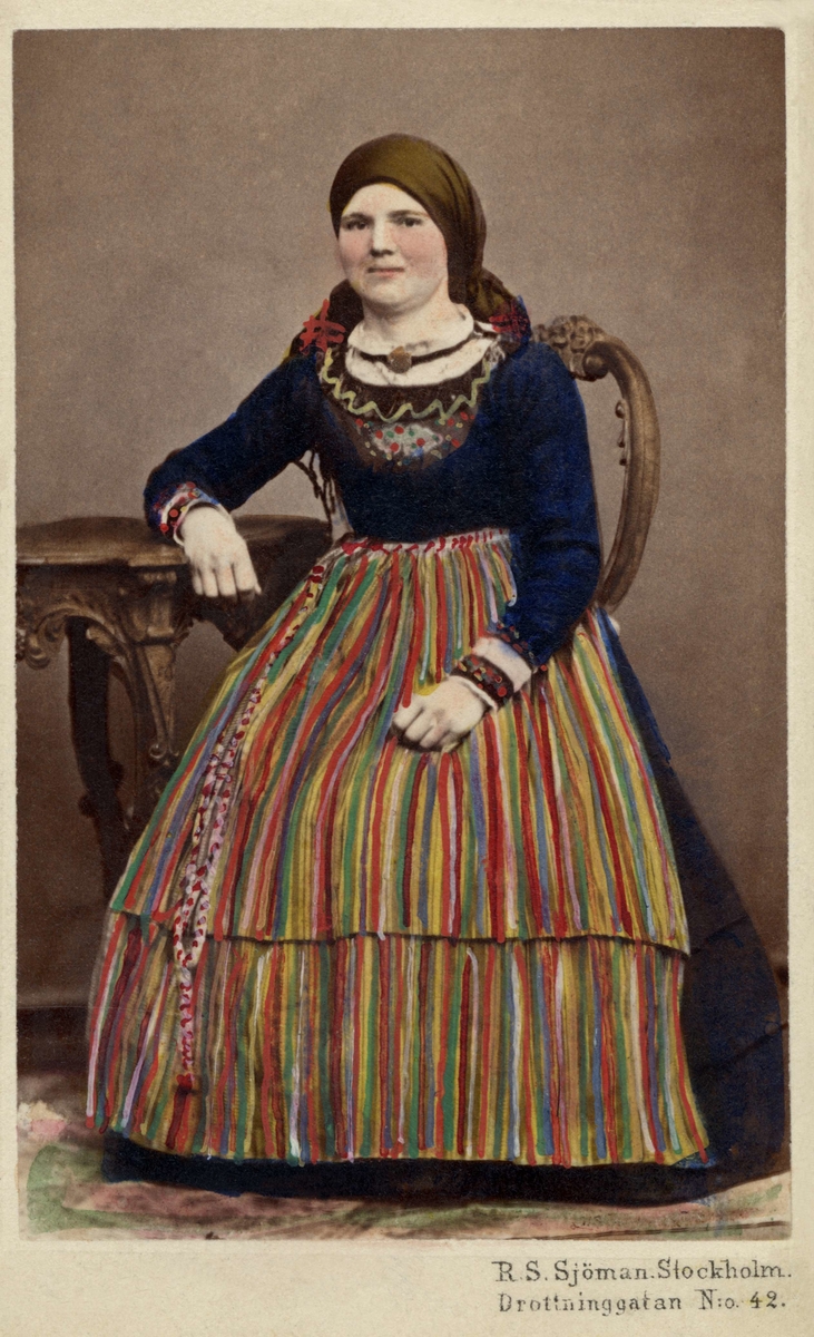 Porträttfotografi av sittande kvinna iklädd folkdräkt, enligt påskrift på kortet från Gummarp i Skåne. Kolorerat i efterhand.