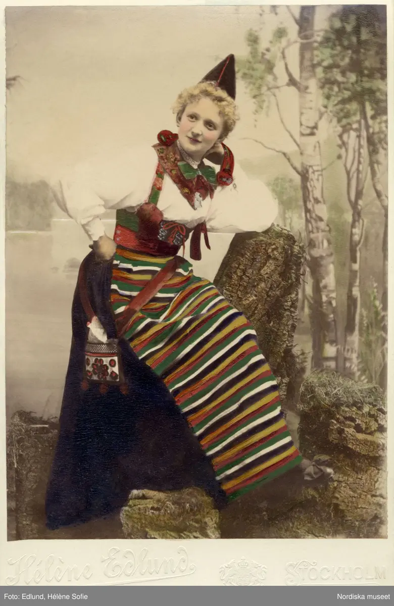 Handkolorerat ateljéfoto på en kvinna i folkdräkt från Dalarna.