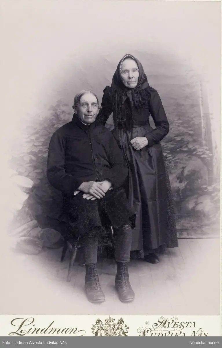 Ateljéporträtt av gammalt par klädda i Nåsdräkt.