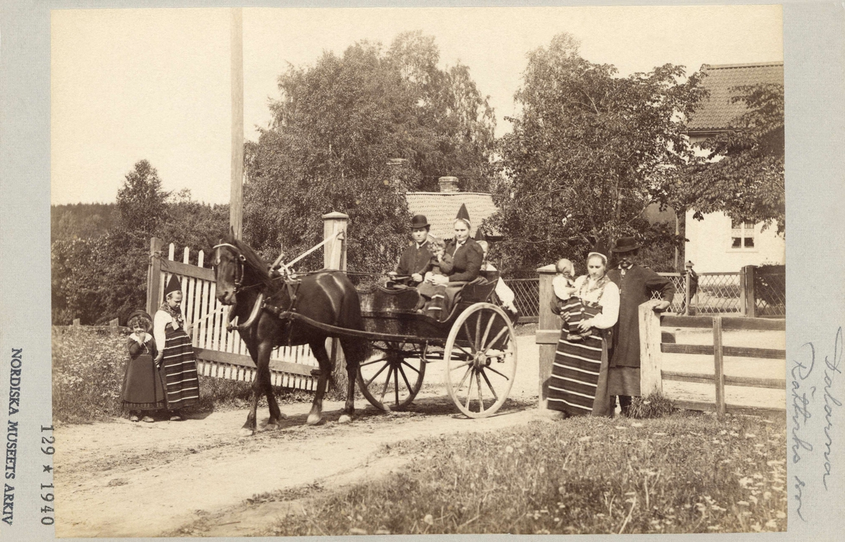 Folkdräktsklädda människor. Hästskjuts vid gård. Grindöppning.