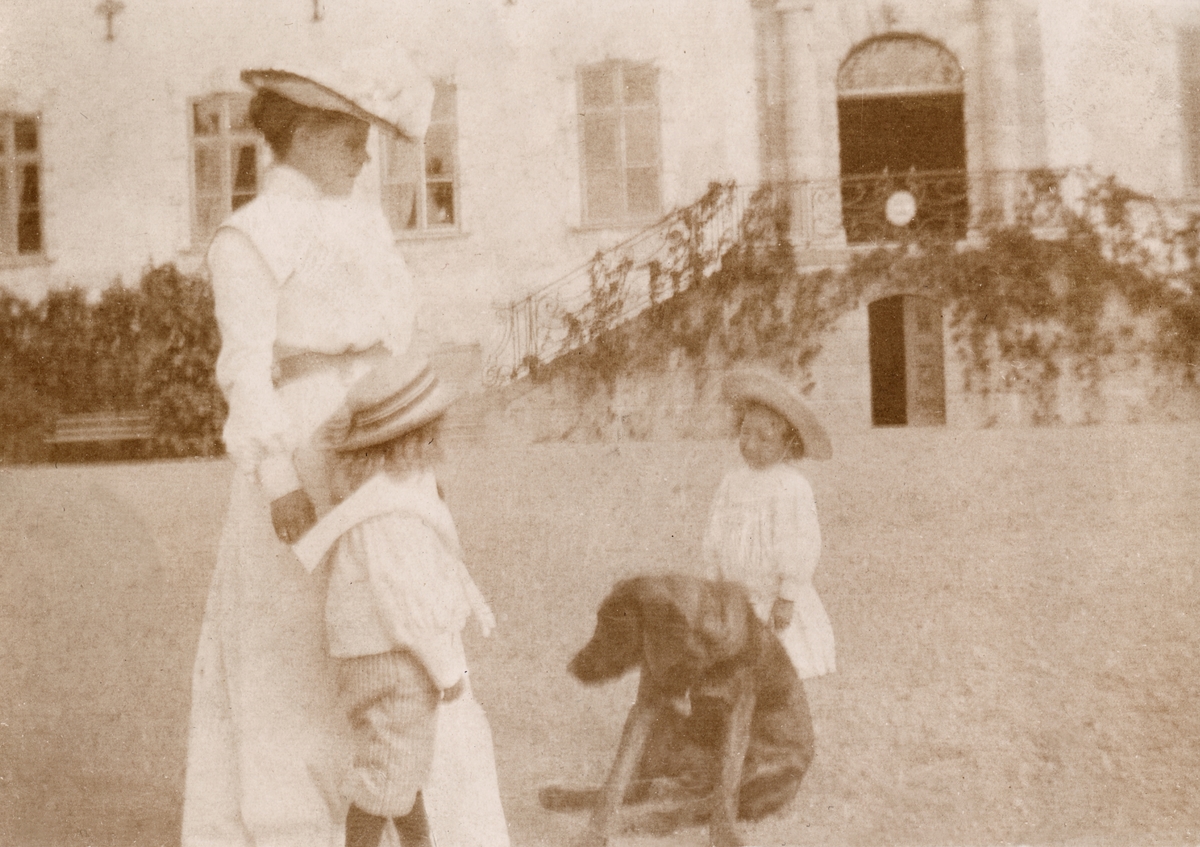 Caroline Lagergren med sönerna Johan och Carl samt en hund på gårdsplanen vid Tyresö slott.