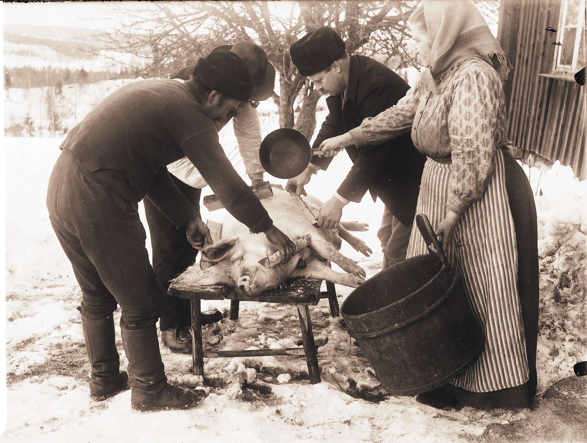 Slakt, skållning av gris. Jösse härad, Mangskog socken, Bjurbäcken, Värmland.