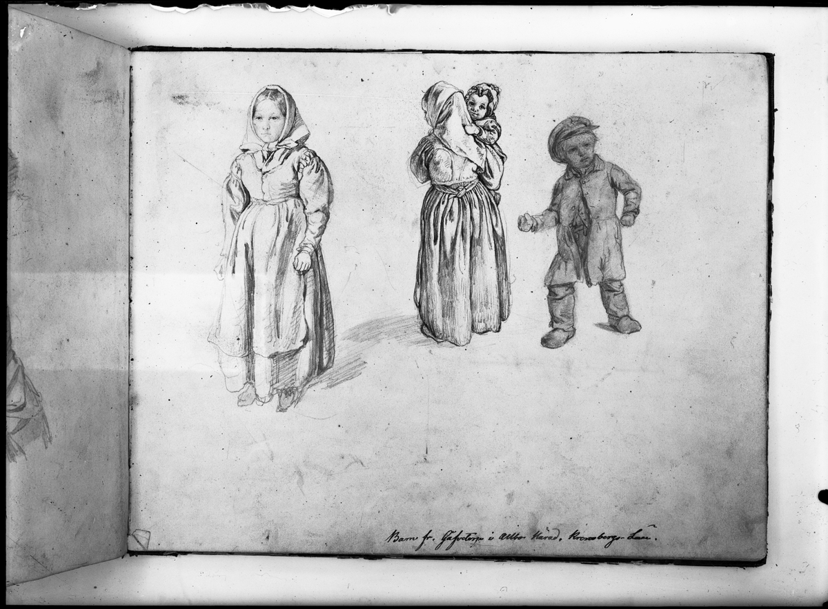 Foto av teckning utförd av Kilian Zoll (1818-1860). Barn från Gåfvetorp i Allbo härad, Småland. Flickor i lång kjol, förkläde och sjal knuten under hakan. En pojke i rock och skärmmössa.