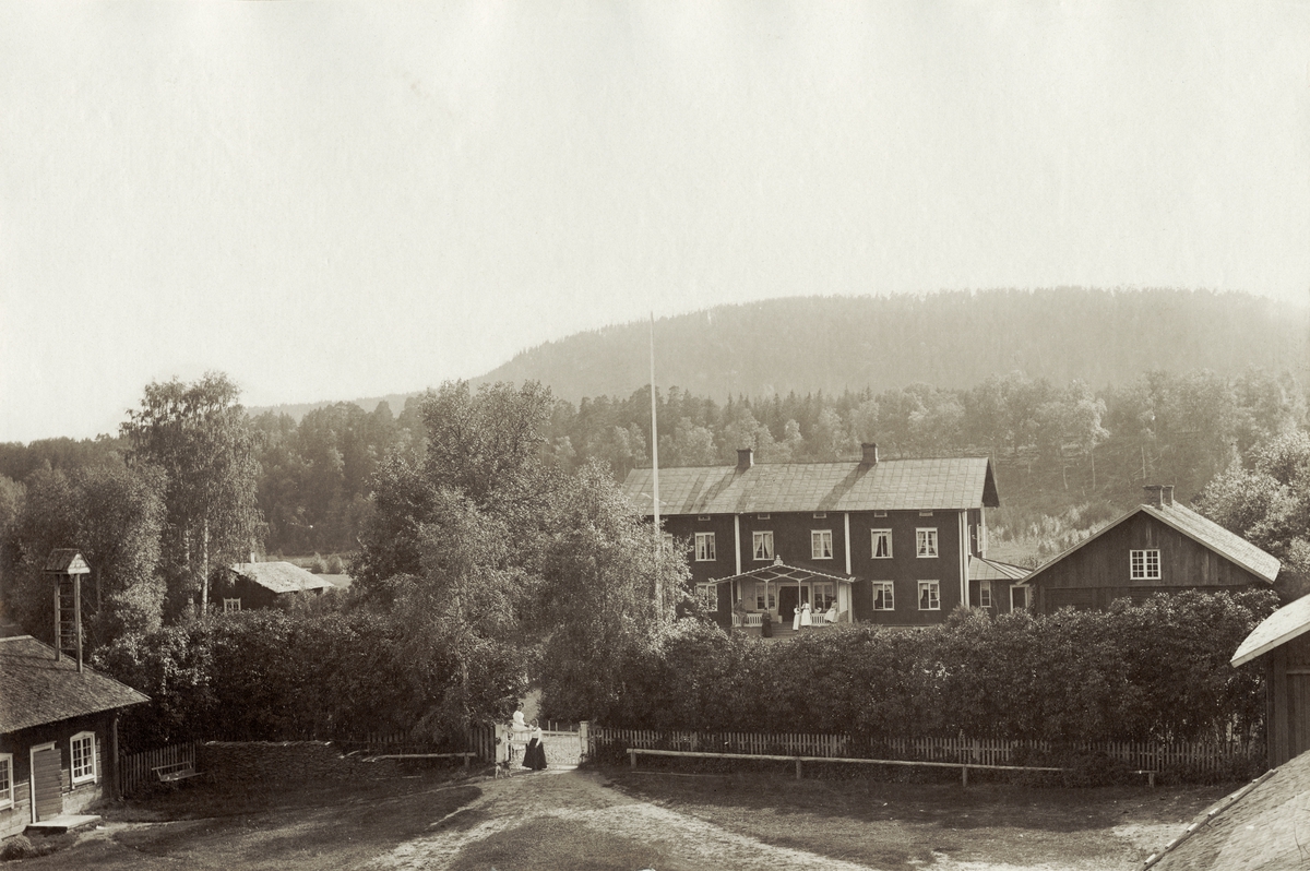 Bostadshuset i två våningar med två flyglar ligger inbäddat i grönska. På gårdsplanen står en flaggstång. Gården är inramad av en frodig häck och staket. Vid grinden står två kvinnor och en hund. I bakgrunden skogsbeklätt berg.