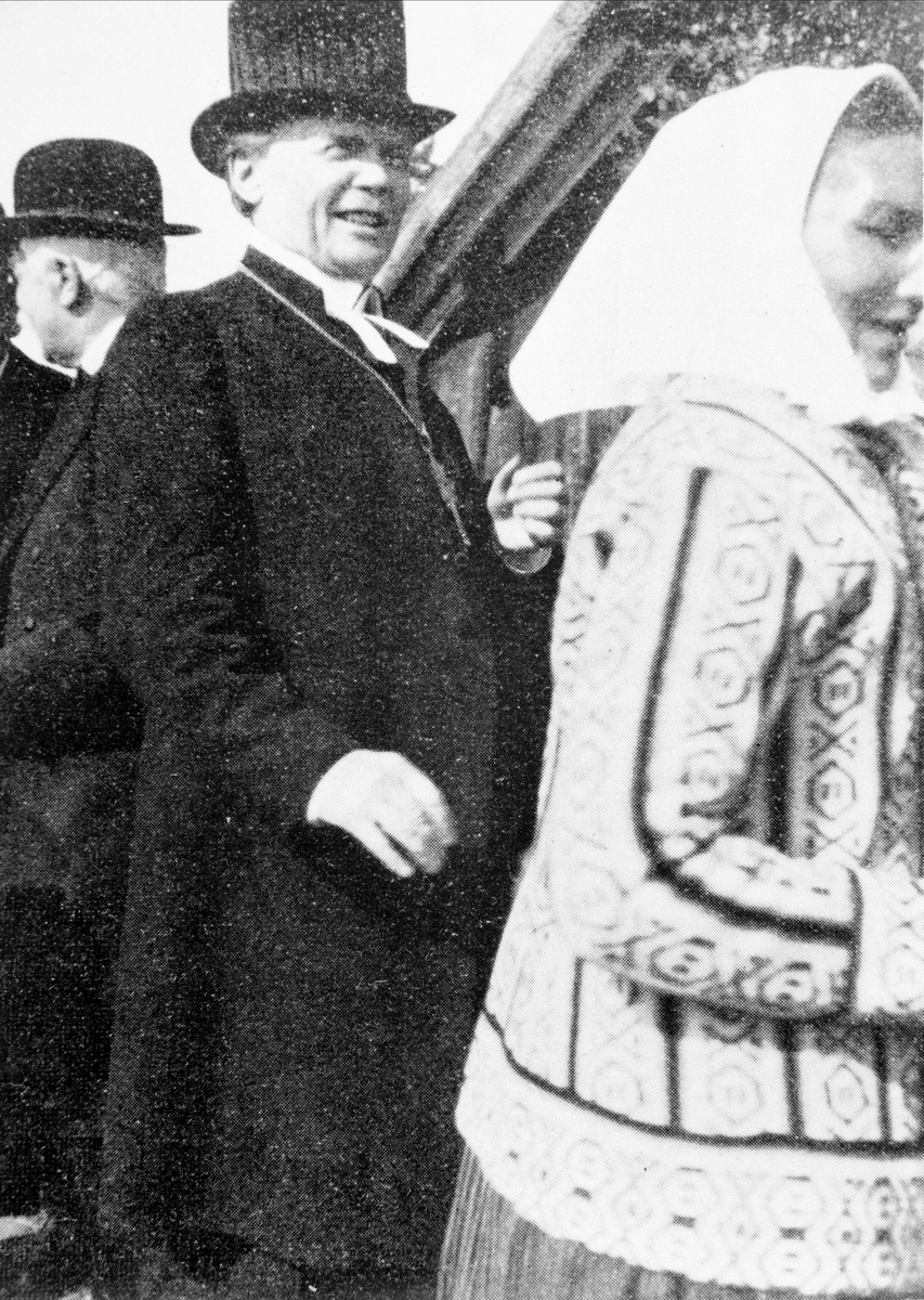 Bålsö fiskeläge, Idenors socken, Hälsningland. "Ärkebiskop Nathan Söderblom vid ett besök vid fiskeläget då han predikade. Han har just hälsat på Josefina Löjdström."