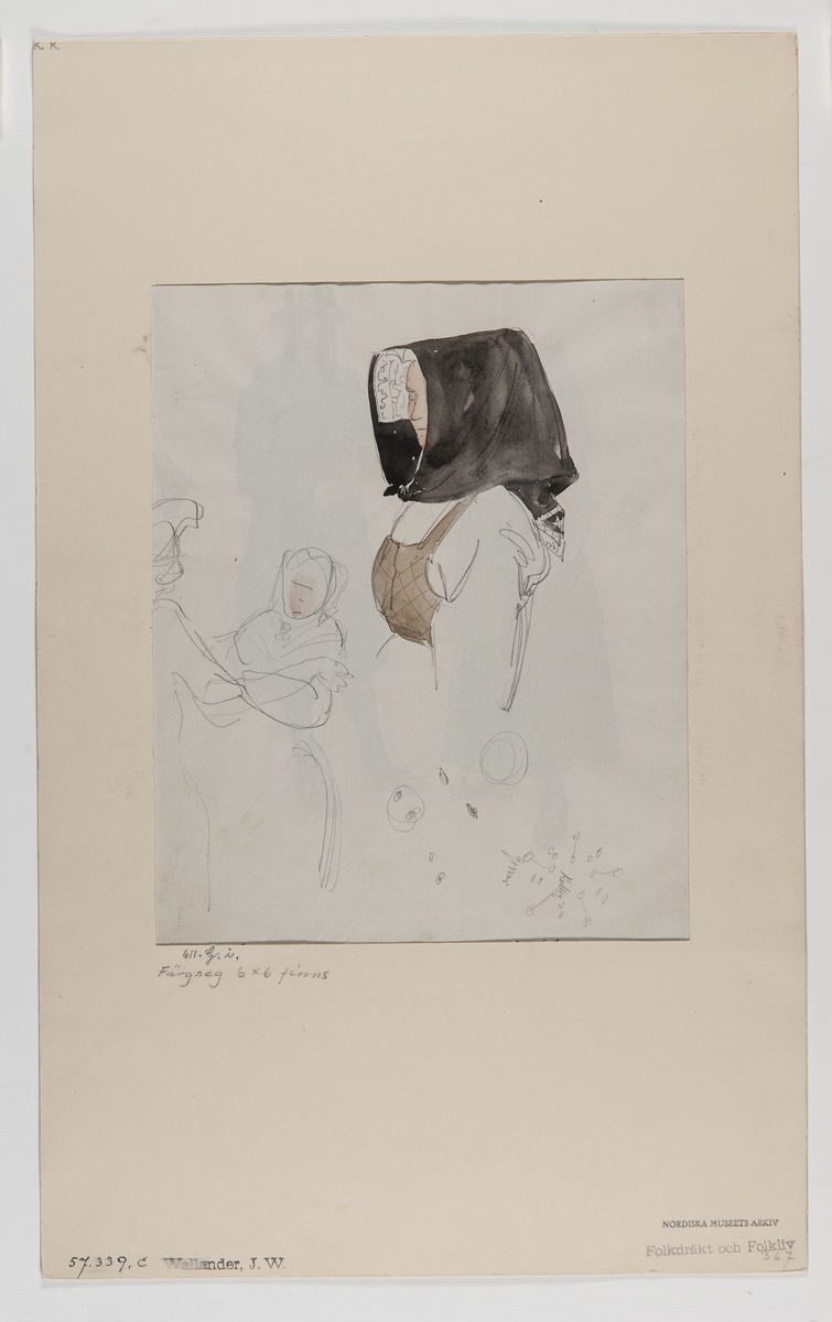 Delvis akvarellerad handteckning av J W Wallander. Kvinnodräkt från Floda, Dalarna. Nordiska museets inventarienummer 57339c.
