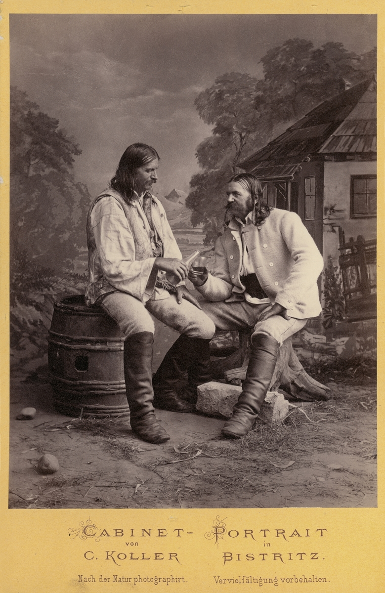 Sachsiska bönder. Två män i folklig dräkt i tablå, fond och rekvisita.. "Sachsische Bauern. Siebenbürgen Sachsen"