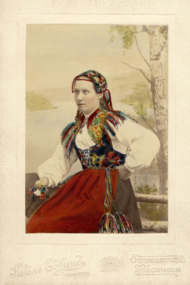 En ung kvinna poserar i en folkdräkt med schalen instoppad i västen. Handkolorerat fotografi.