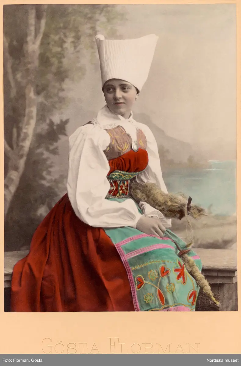En Kvinna klädd i en folkdräkt, sitter och spinner garn