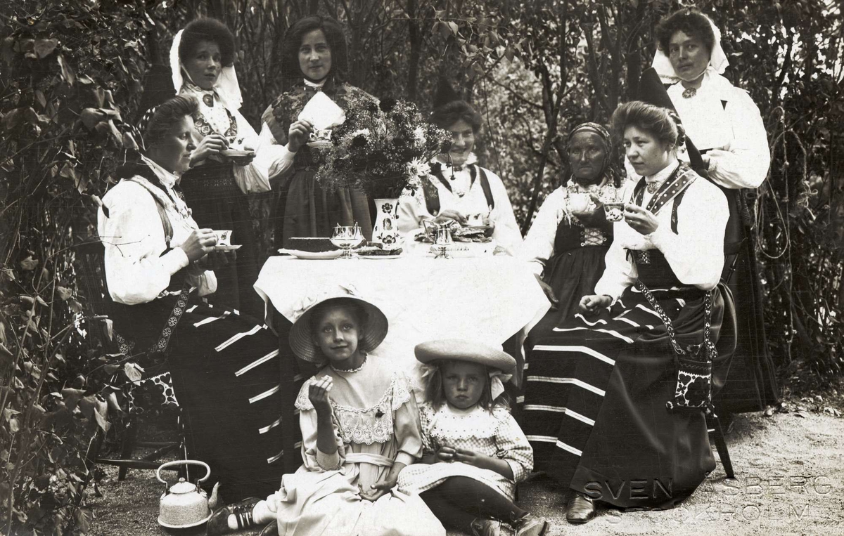 Kullor dricker kaffe på Skansen. Fr v Krans Kerstin, Djos Kerstin, Svarvar Anna, Blecko Kerstin, Buller mor, Hållams Kerstin, Gjers Kerstin.