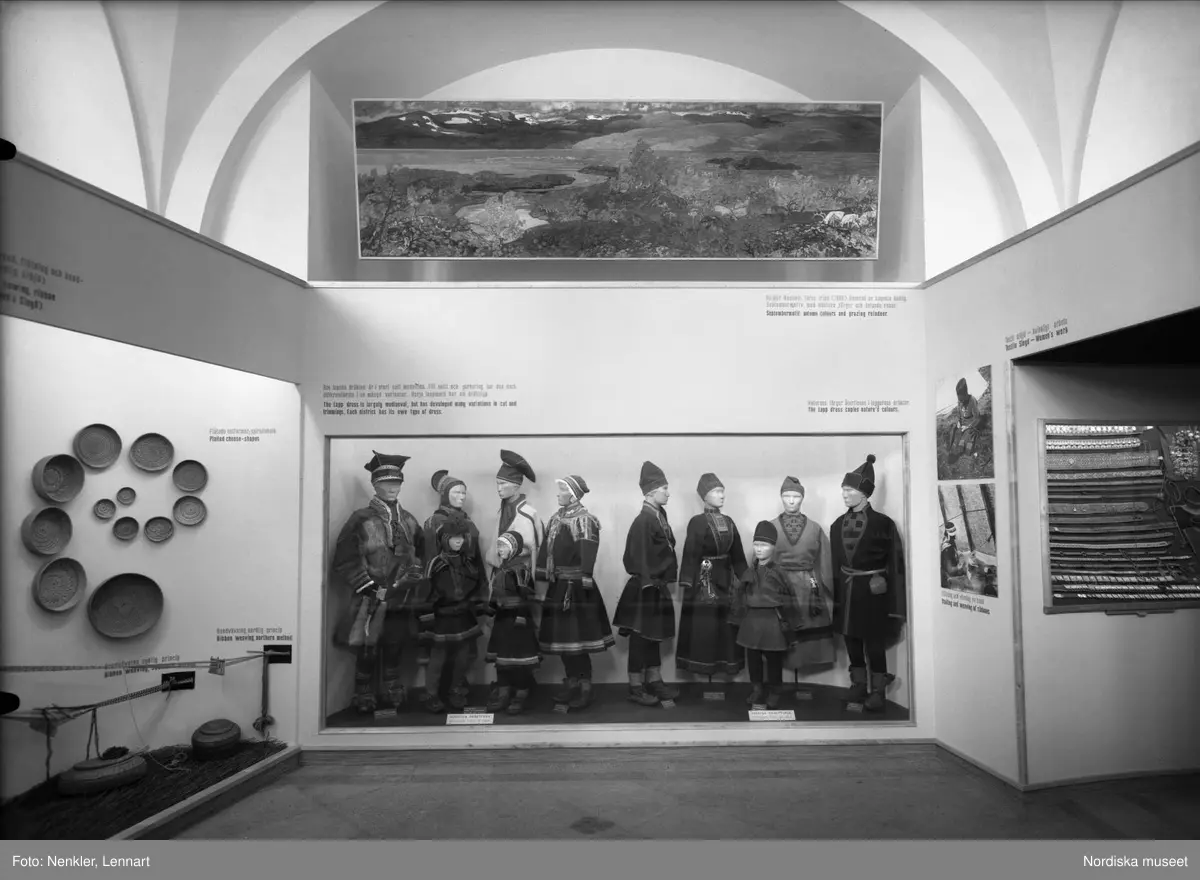 Nordiska museet. Lapska avdelningen. Skådesamlingens nymontering 1947. Lapska avdelningen. Valv 4. Dräktmonter; dräkterna i två grupper, nordliga (t.v.) och sydliga dräkttyper. Under valvet Helmer Osslunds målning "Torne träsk" (1909).