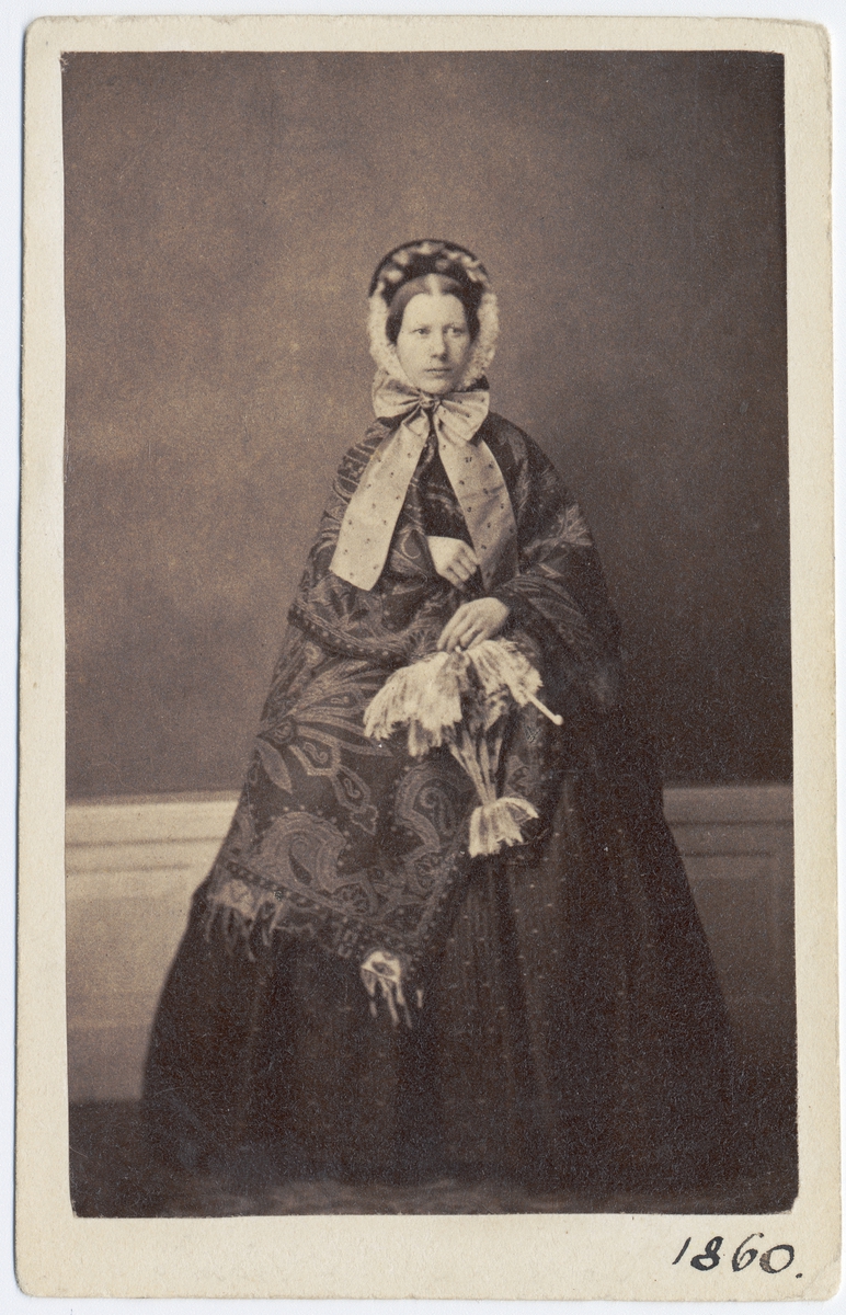 Kabinettkort. Porträtt, helfigur, av fru Thérèse Weber f. Widelius. Hon är iklädd mörk, vid kjol och över axlarna bär hon en stor, paisleymönstrad sjal. Hon har mössa med breda band knutna i rosett under hakan och ett parasoll i handen.