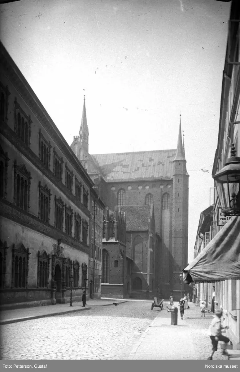 Vy från norra Tyskland, Wismar. Fürstenhof, till vänster Georgenkirche.
