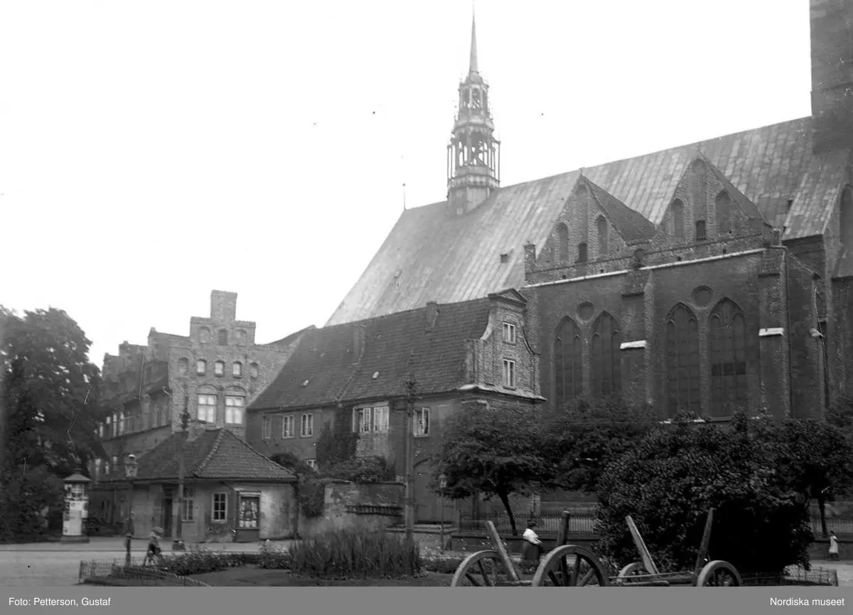 Vy från norra Tyskland, Lübeck. Rad av byggnader norr om Jakobikirche.