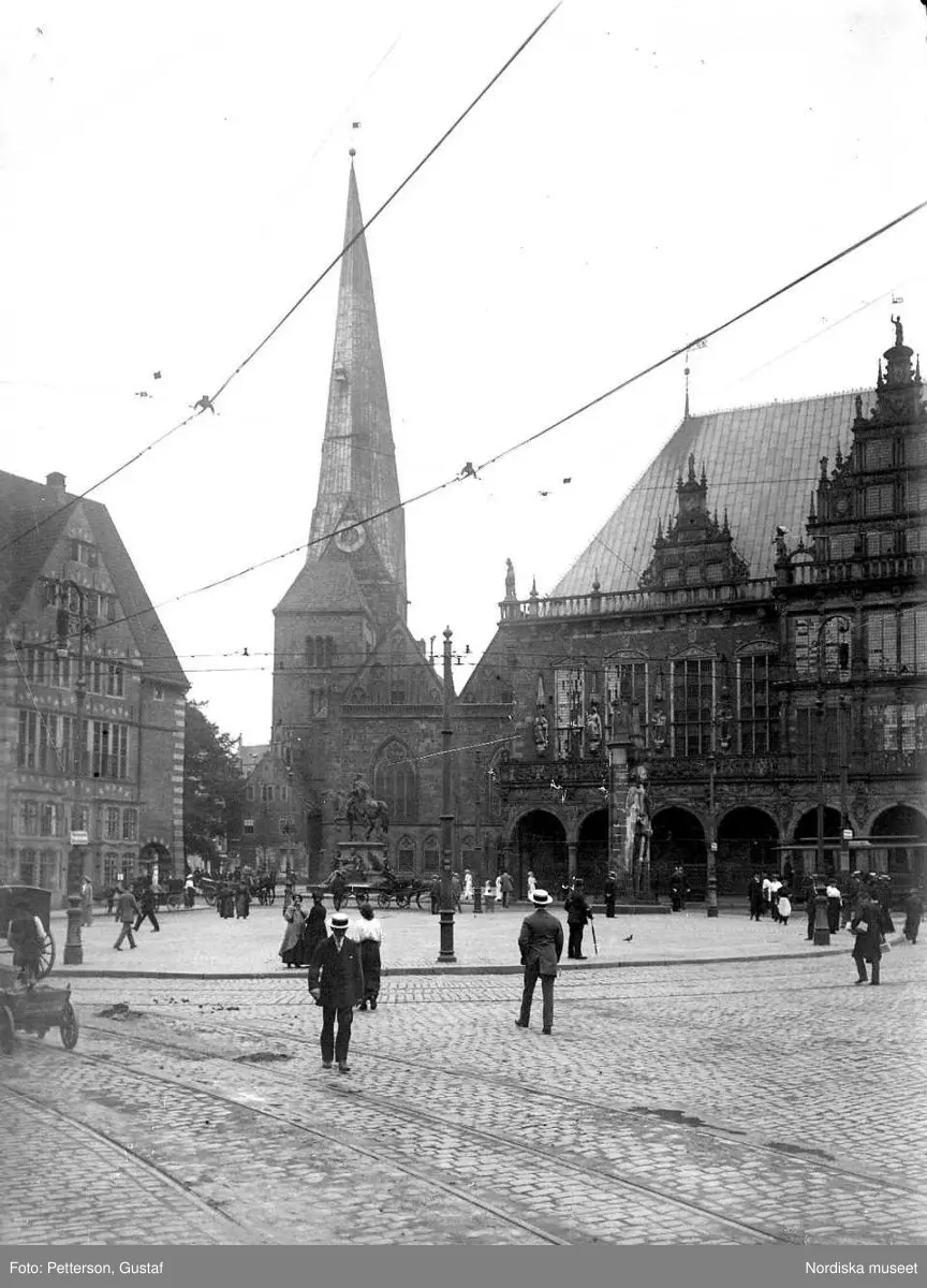 Vy från norra Tyskland, Bremen. Hörn av Rådhuset, Liebfrauenkirche, Kaiser Wihelm I Roland.