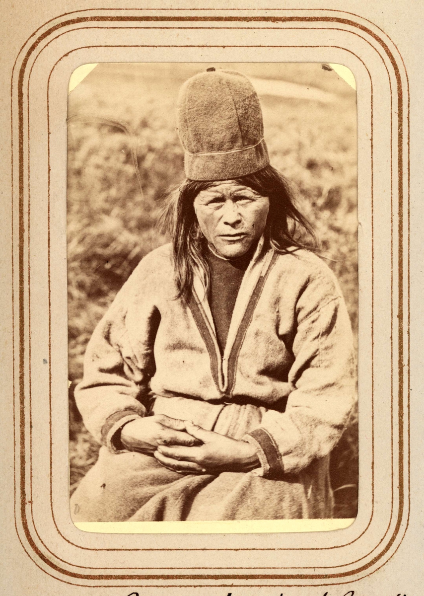 Porträtt av änkan Ristin Menlös f. Pantsi, 44 år, Tuorpons sameby. Ur Lotten von Dübens fotoalbum med motiv från den etnologiska expedition till Lappland som leddes av hennes make Gustaf von Düben 1868.