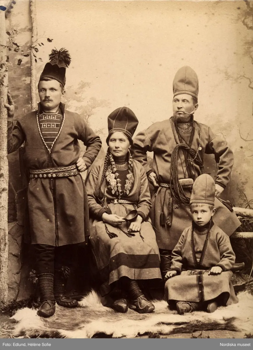 Gruppbild med fyra personer iklädda samiska folkdräkter. Studiofotografi 1912.