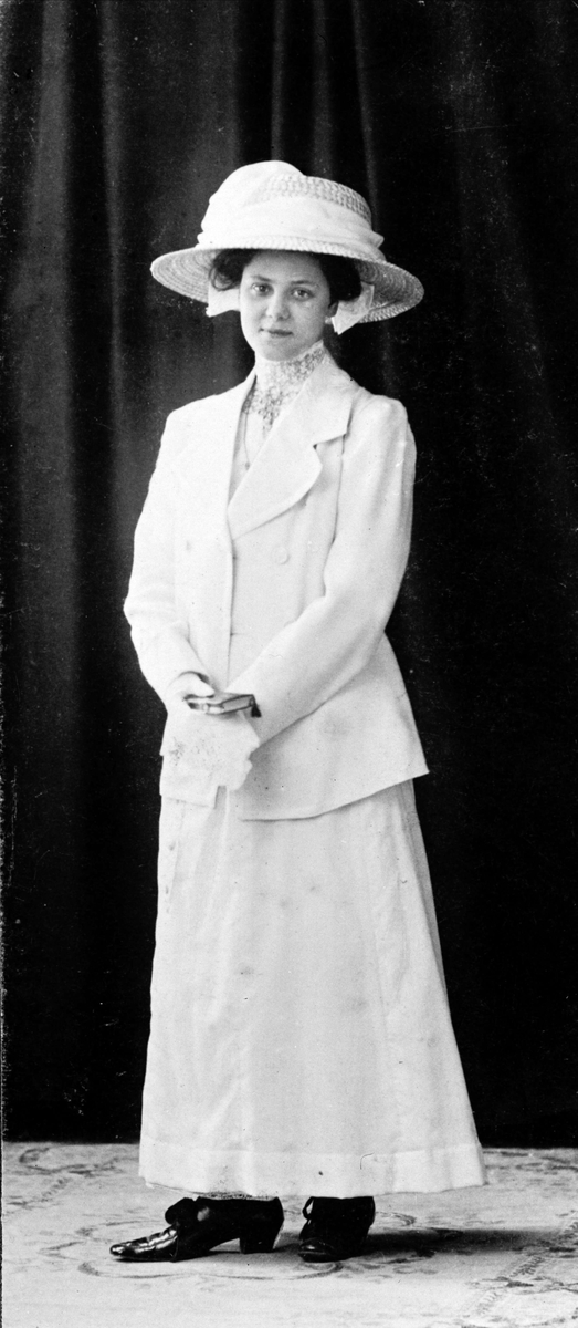 Mode. Ur kollektionen "Vackra flickor förr i världen". Kvinna i vit långdräkt och hatt.