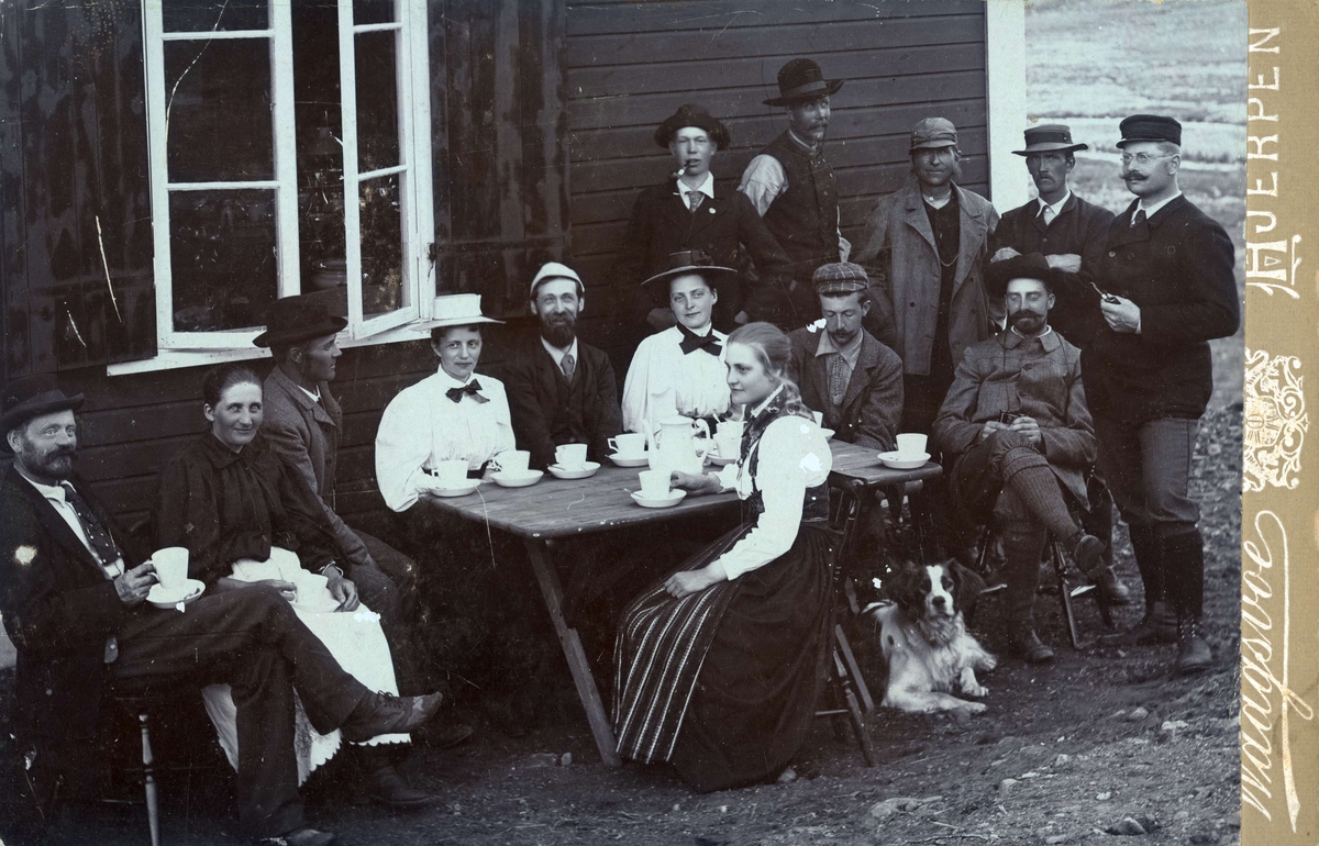 De första turisterna. Invigning med kafferep vid Sylstugan. Johan Lindström Saxon, tidningsman och bokförläggare i mitten vid bordet. Längst t h STF:s skattmästare, Folke Wancke.
