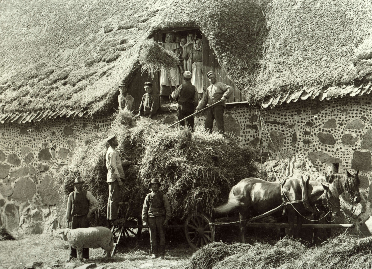 Sädeskärvar hivas upp på skullen till den gamla ekonomibyggnaden, Uranienborgs kungsgård, Rönneberga härad, ön Ven utanför Landskrona, Skåne.