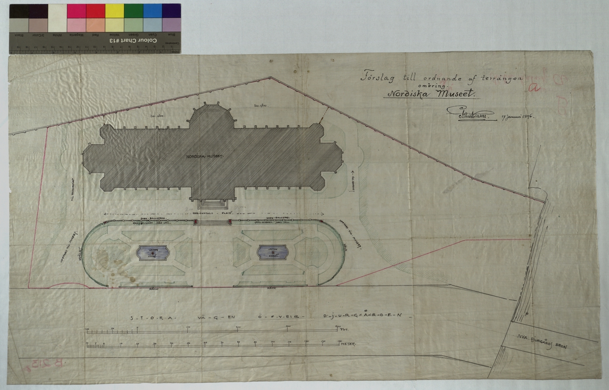 Förslag till ordnande af terrängen omkring Nordiska museet.Vattenkonst. Häck, Uppfart till museet. Till kansliet. Till restauration. Bakgård.