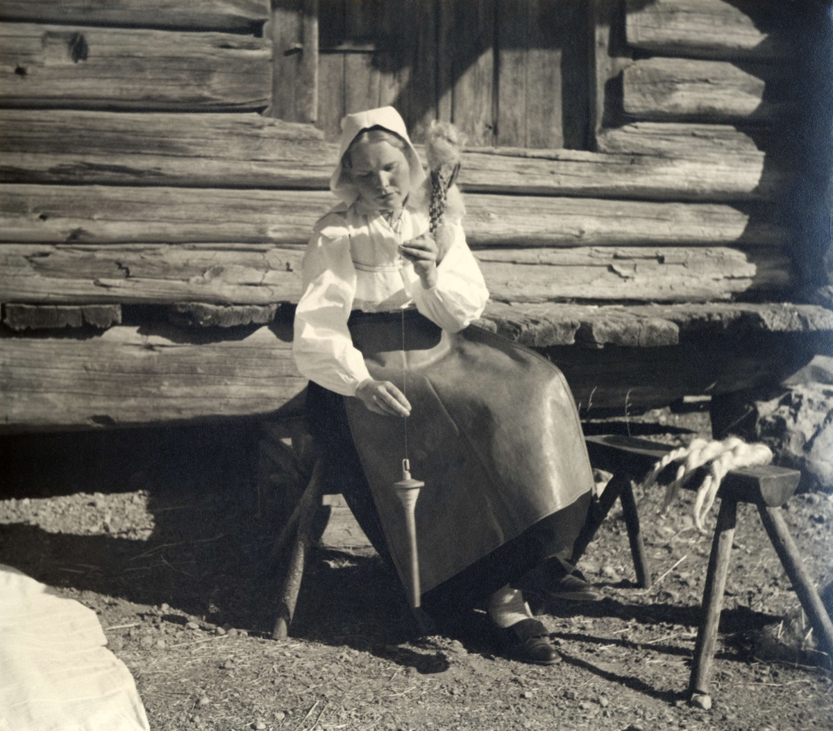 Spånad på slända, Orsa. En kvinna sitter utanför en liggtimrad byggnad och spinner ullgarn på hängande slända.