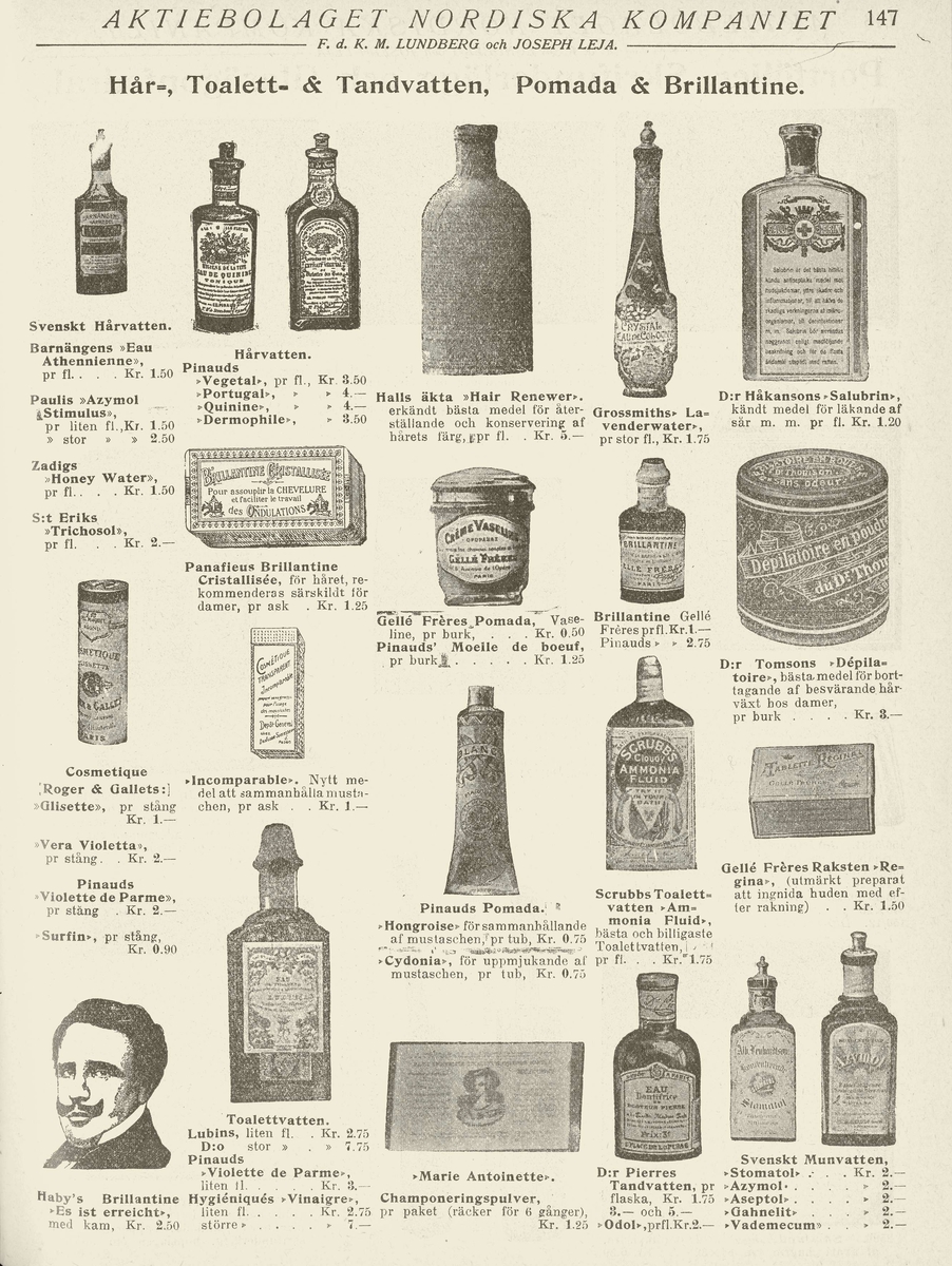 Katalog vintern 1905-1906. AB Nordiska Kompaniet, Stockholm. Hår-, Toalett- & Tandvatten, Pomada & Brilliantine.