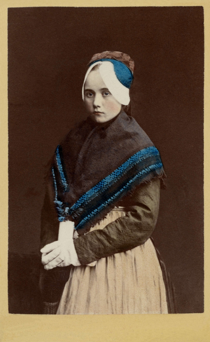 Ung kvinna iklädd dräkt, delvis kolorerat fotografi