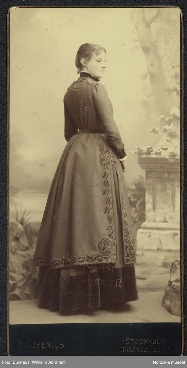 Kabinettsfotografi. Porträtt av kvinna iklädd reformdräkt. Kroppen sedd snett bakifrån, ansiktet i halvprofil. Ateljébild.