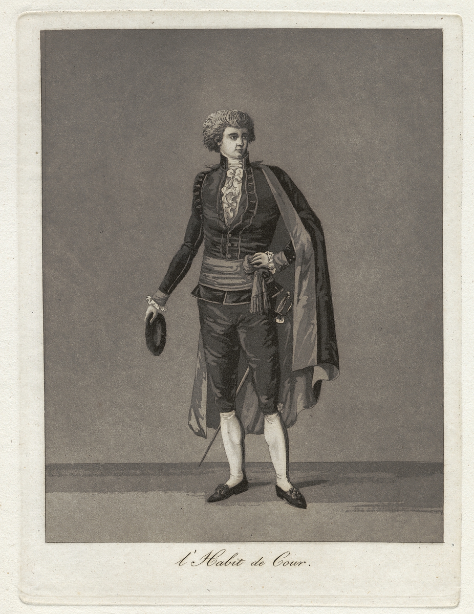 Gustaf III:s nationella dräkt/svenska dräkten. "L'Habit de Cour." Herre i hovdräkt. Akvatint av Johan Abraham Aleander, trol. 1780-tal.