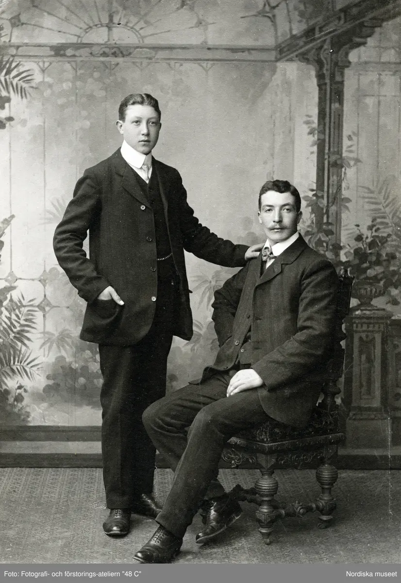 Ateljéporträtt av två unga män i kostym. Kabinettkort