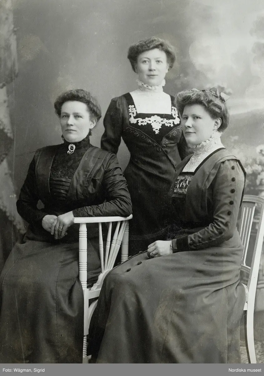 Ateljéporträtt av tre medelålders kvinnor i klänningar med broderier och höga spetskragar. Kabinettkort.