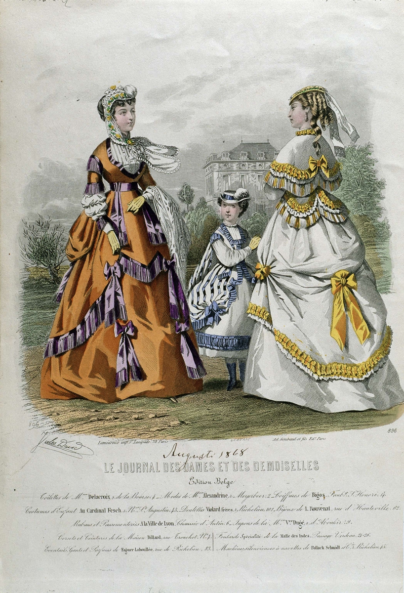 Modeplansch från 1868 ur Journal des Dames et des Demoiselles. Två kvinnor och en flicka i modedräkter.