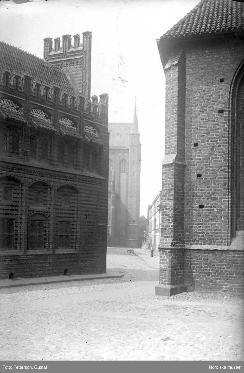 Vy från norra Tyskland, Wismar. Pass mellan Alte Schule och gammal byggnad vid Marienkirche. Gerorgenkirche i fonden.