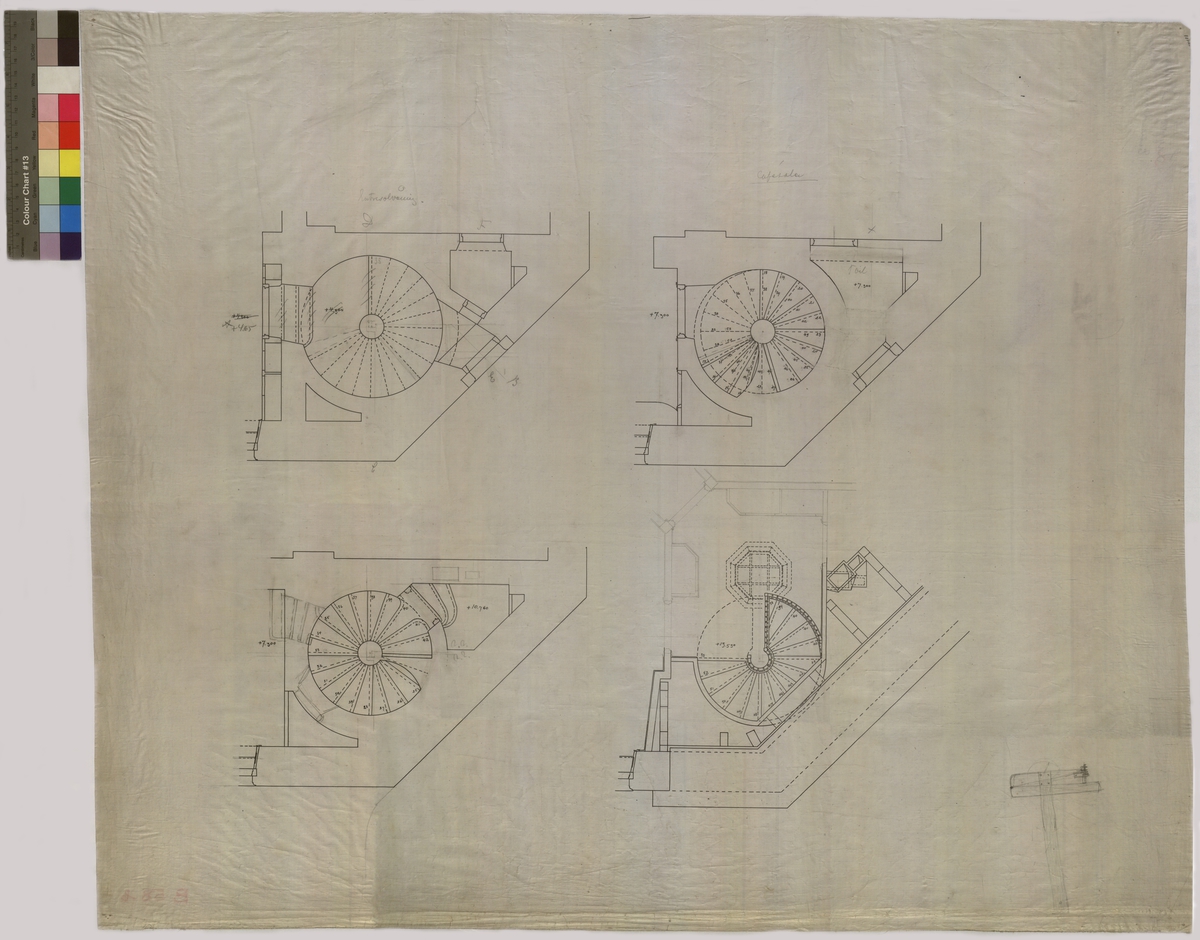 Ritning på väv över Nordiska museets huvudbyggnad. Entresolvåning. Kafésalen.Toalett. Plan. Kafébygnaden, spiraltrappan. Tusch och blyerts. Linjalritning. Osignerad.
