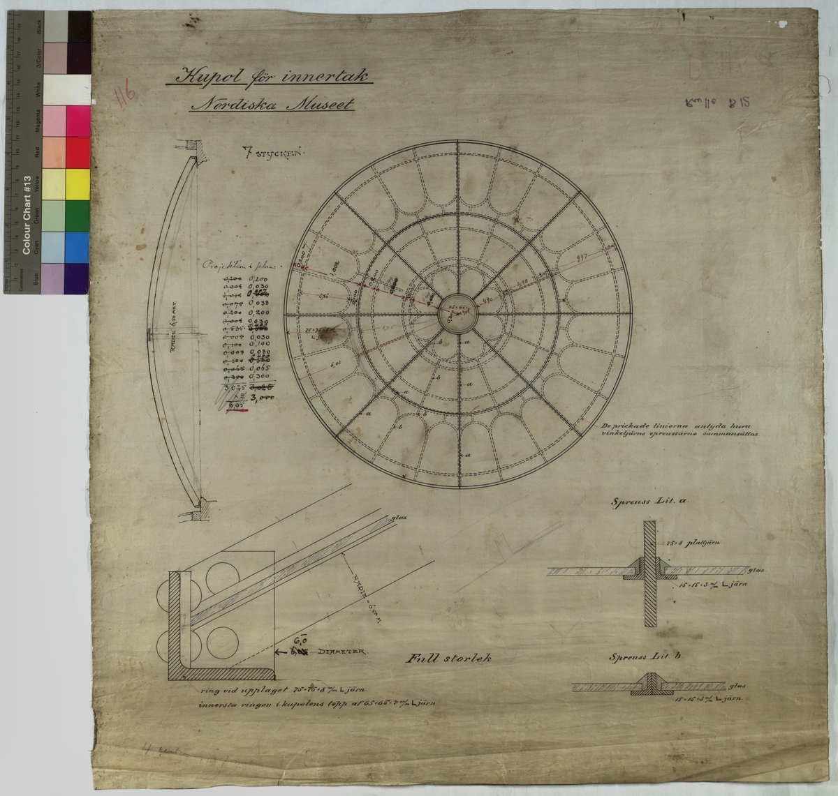 Kupol för innertak. Nordiska museet innertak. De prickade linierna antyda huru vinkeljärns spreussarne sammansättas.