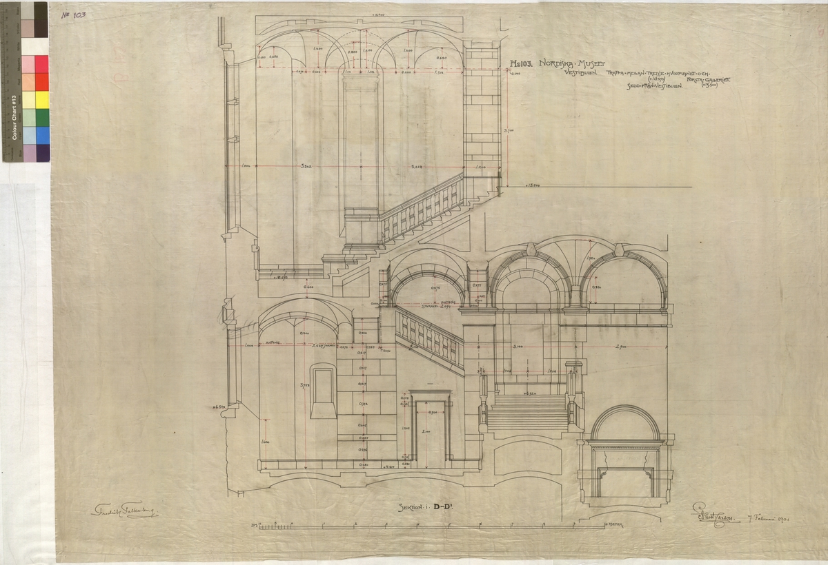 No 103 Nordiska Museet. Vestibulen. Trappa mellan tredje hviloplanet och första galleriet sedd från Vestibulen.