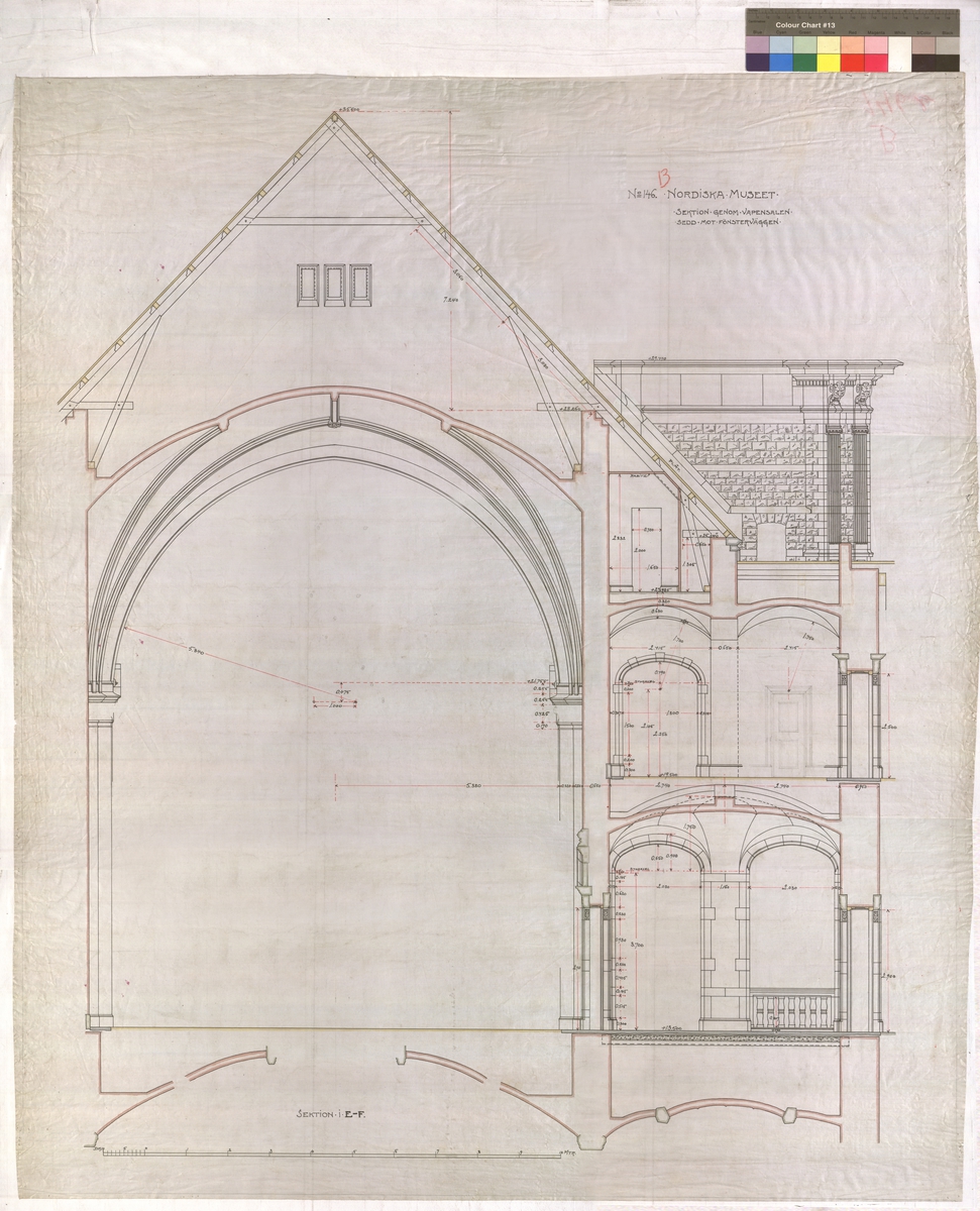 No 146 Nordiska museet. Sektion genom Vapensalen sedd mot fönsterväggen.