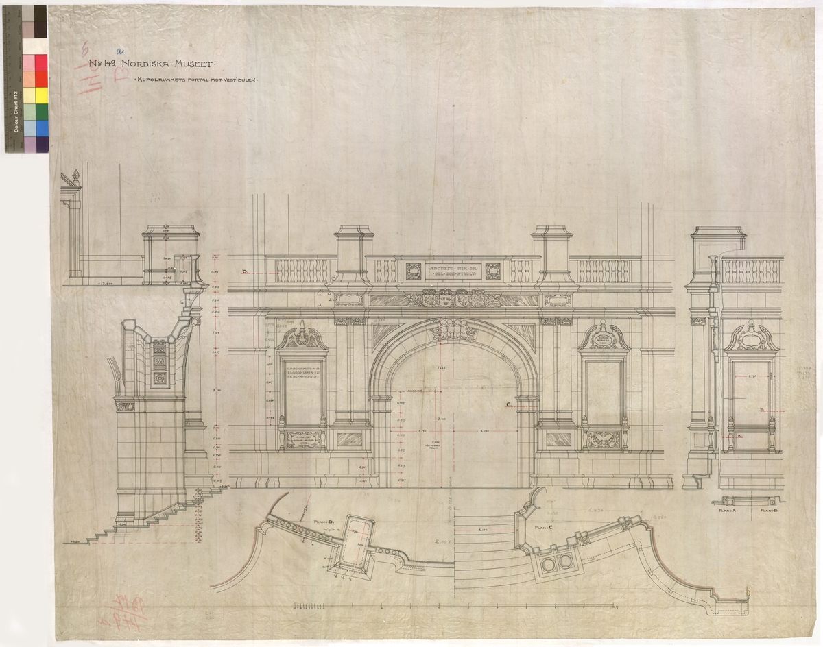 No 149. Nordiska museet. Kupolrummets portal mot vestibulen. ABCDEFGHIK OM SOL OCH RTVOL CR BONIFACIVS EL GODHIÄRTA TK CE BANVNO G O