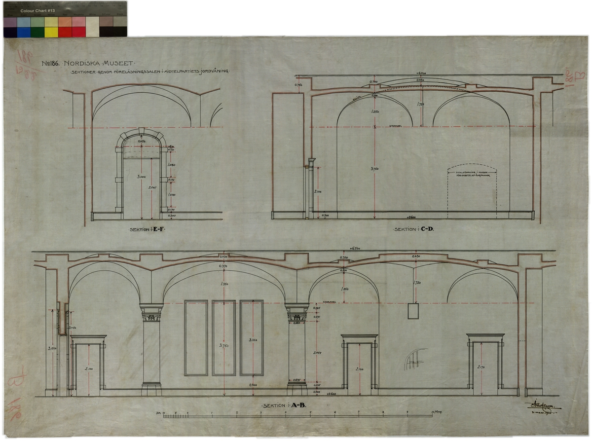 No 186. Nordiska Museet. Sektioner genom föreläsningssalen i midtelpartiet jordvåning. Hvalföppning för ombyte af ångpannor.