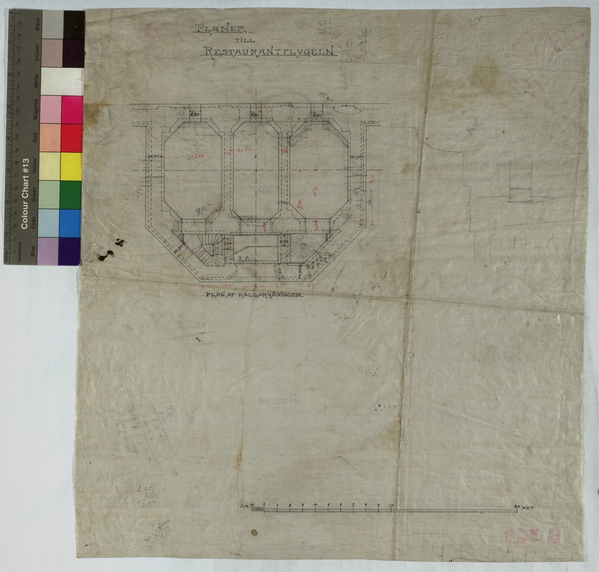 Planer till restaurantflygeln. Plan af källarvåningen.