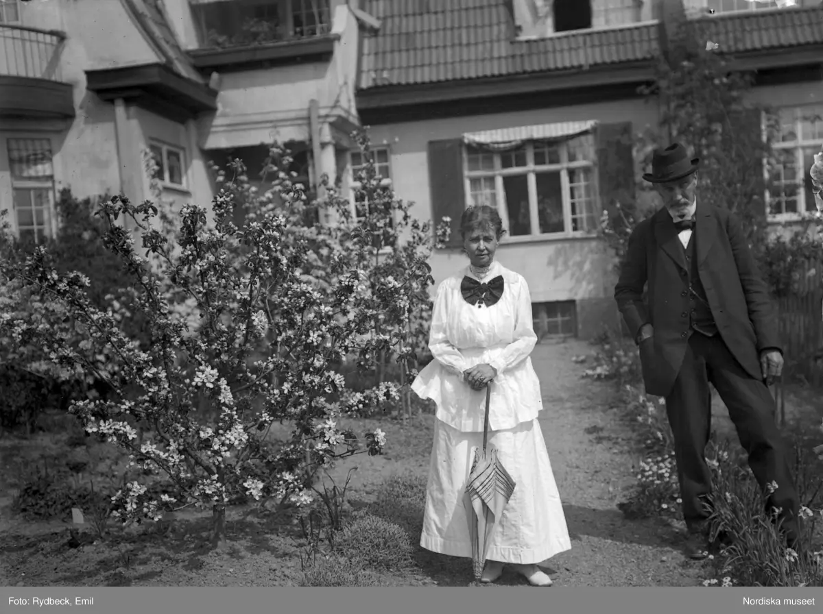 Porträtt av ett par framför Tekla Wrangels bostad på Lidingön.