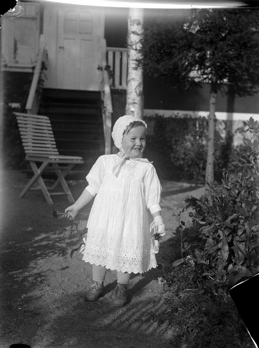 En liten flicka i vit sommarklänning och vit knytmössa på en trädgårdsgång.