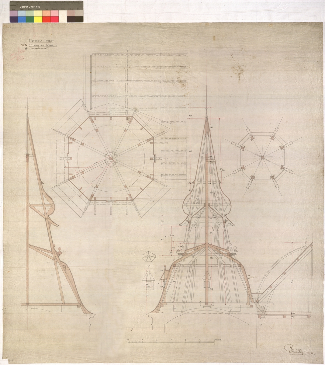 Nordiska Museet. No 14 [numret överstruket] 18 Ritning till spiror på trapptornen.