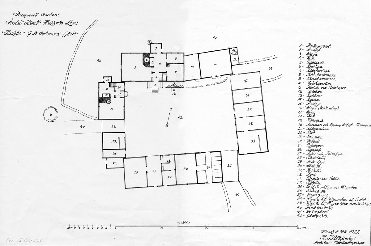 Nordiska museets byundersökningar. Uppmätning av gården Halsbo, Drängsereds socken, Halland, 1927.
