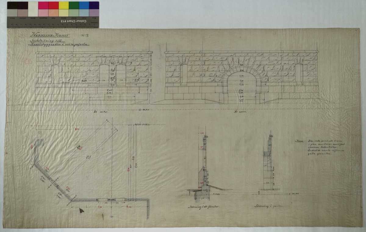 Nordiska Museet. No 3. Sockelritning till Kanslibyggnaden å norra gafveln. Skärning i ett fönster. Skärning i porten. Den röda prickade linien i plan markerar murlifvet ofvanom kodonlisten.
