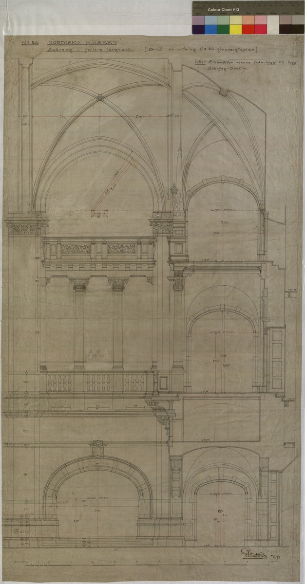 No 25. Nordiska museet. Skärning i Hallens längdaxel E-F se ritn No 20 öfversigtsplan.