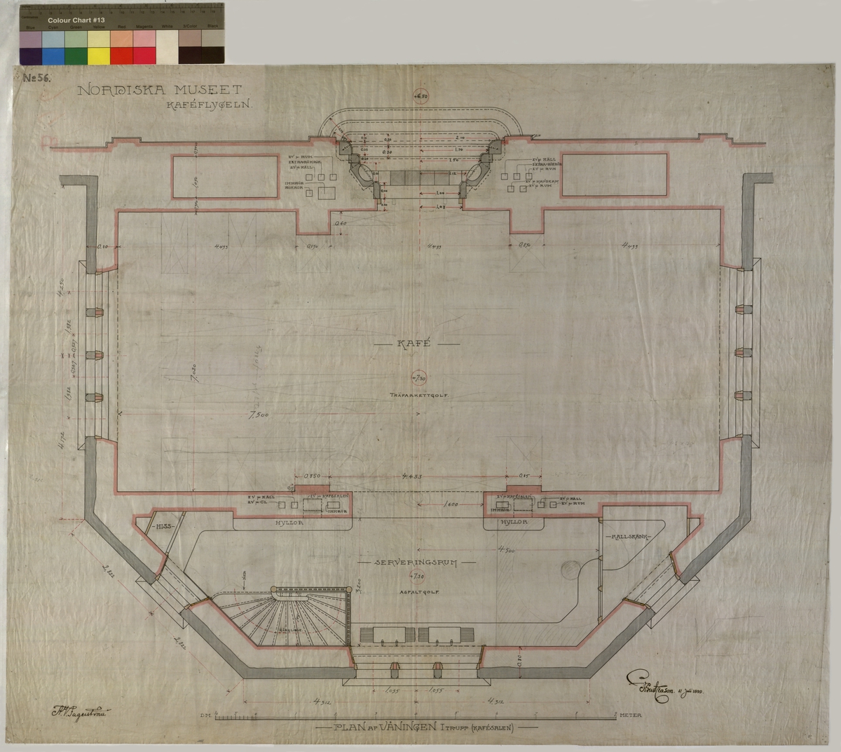 Nordiska Museet. Kaféflygeln. Plan af Våningen 1 tr upp. Kafé. Träparkettgolf. Serveringsrum. Asfaltgolf. Kallskänk..